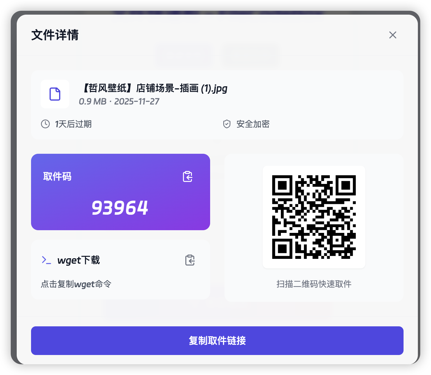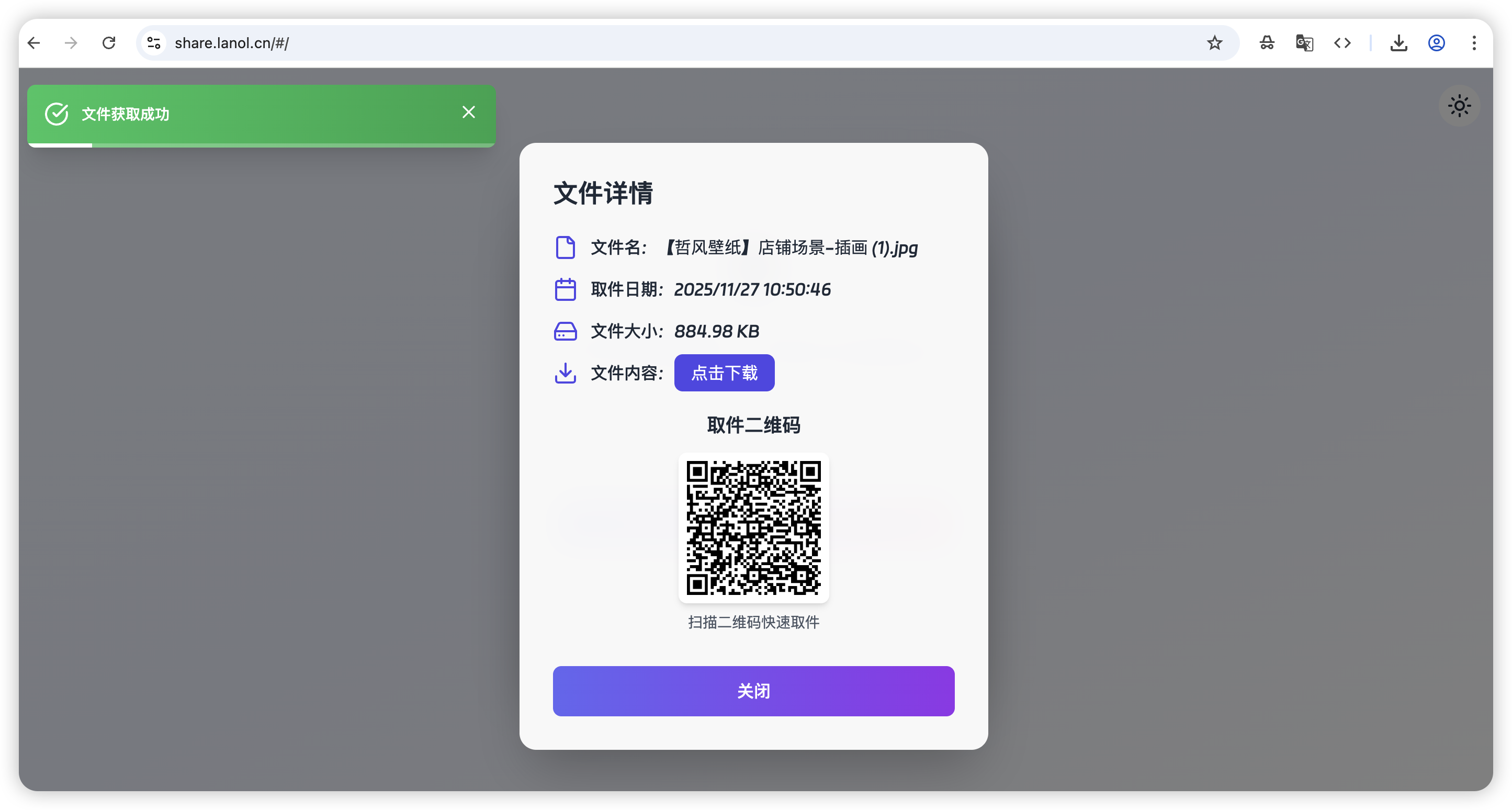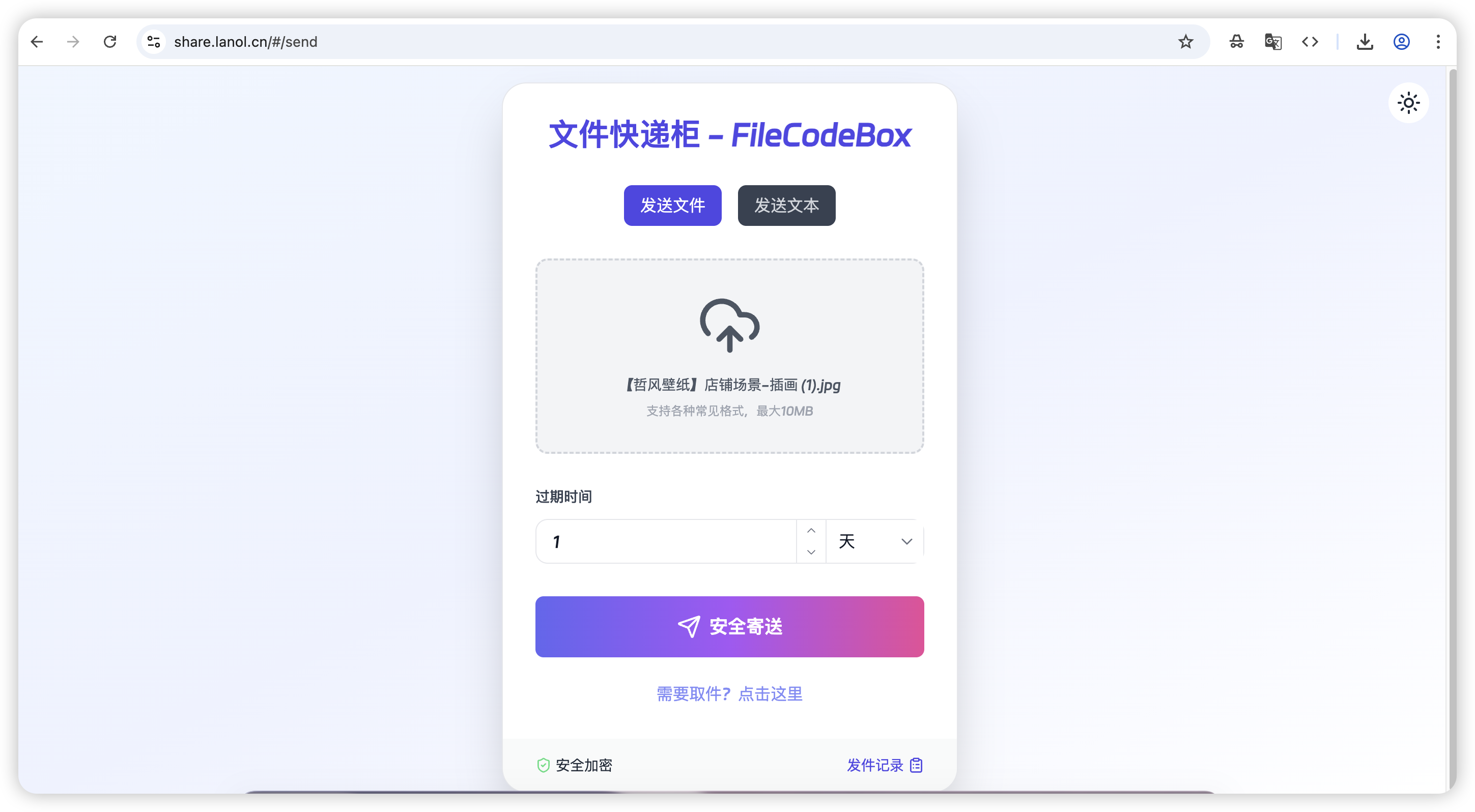 页面还是蛮简洁的,无需登录,全程匿名,比如我发送一张图片,设置过期时间1天,这样就会得到一个5位数的取件码,和一个直接取件的二维码,或者是取件链接,可以把链接直接分享给其他人,或者直接在首页输入取件码,你就拿到了这张图片